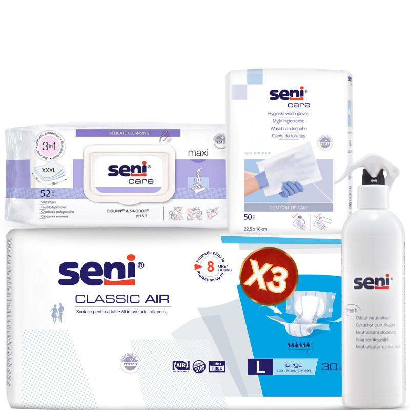 Pachetul pentru Îngrijitor: 3x Seni Classic Air L + Kit Protecție și Neutralizare Miros
