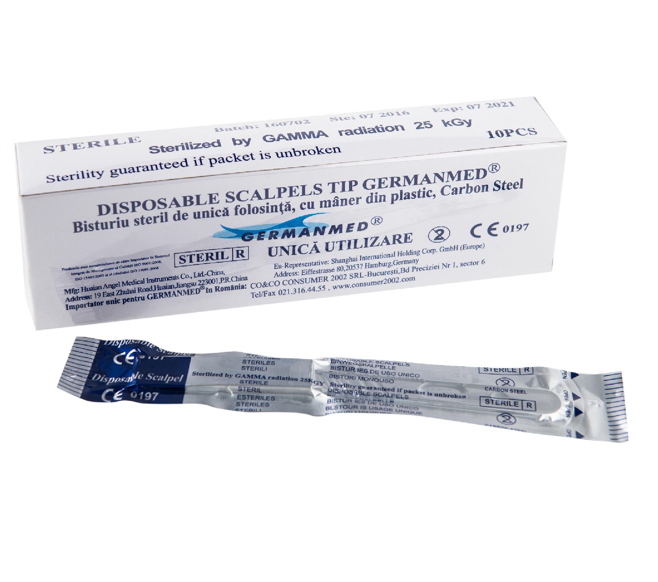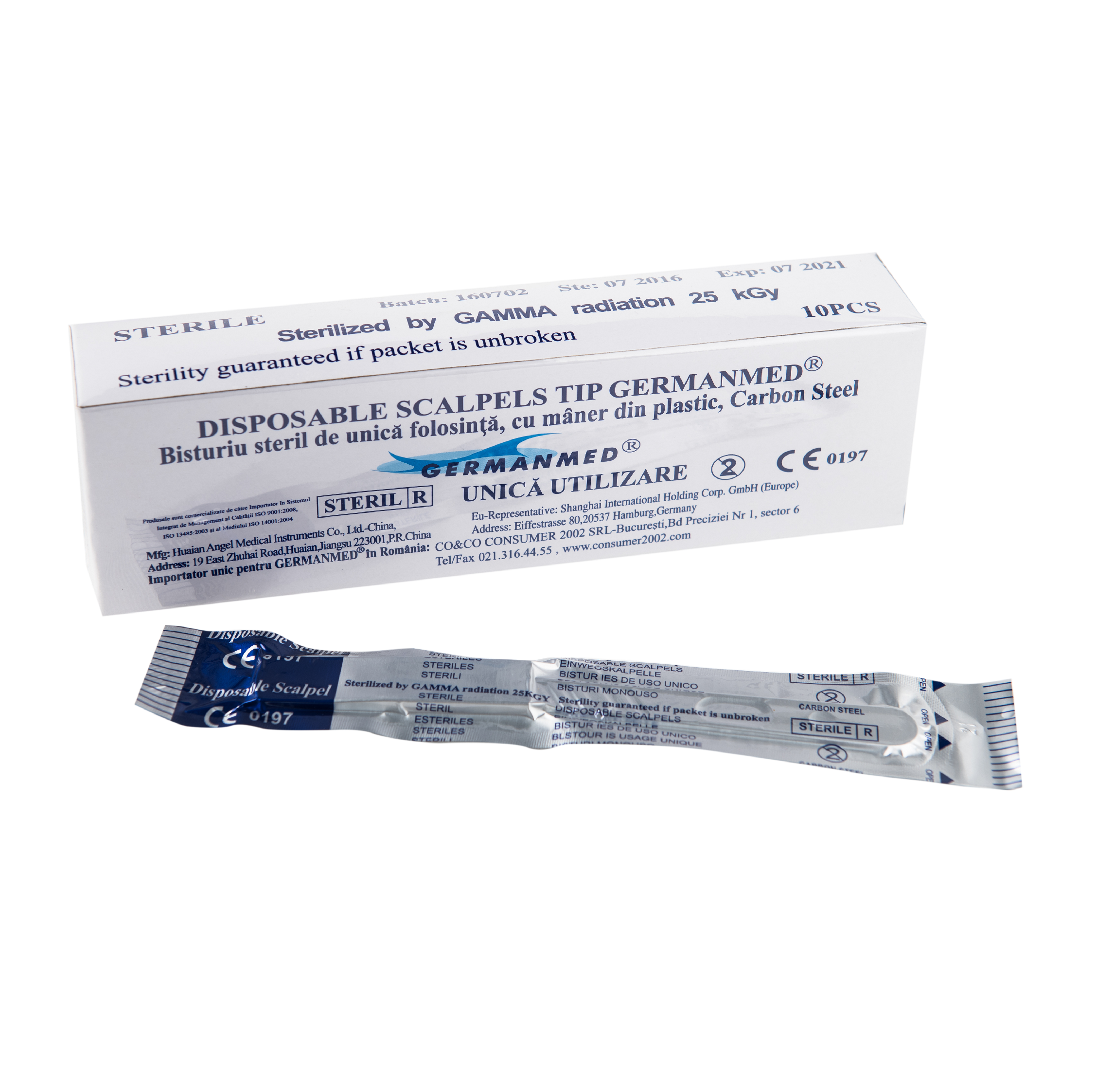 Bisturiul de unica folosinta GermanMed 10, are maner din plastic ergonomic, lame de bisturiu, din otel inoxidabil, ascutite pe toata lungimea, inhibitor de rugina- hartie VCI impregnata. Sterilizat.