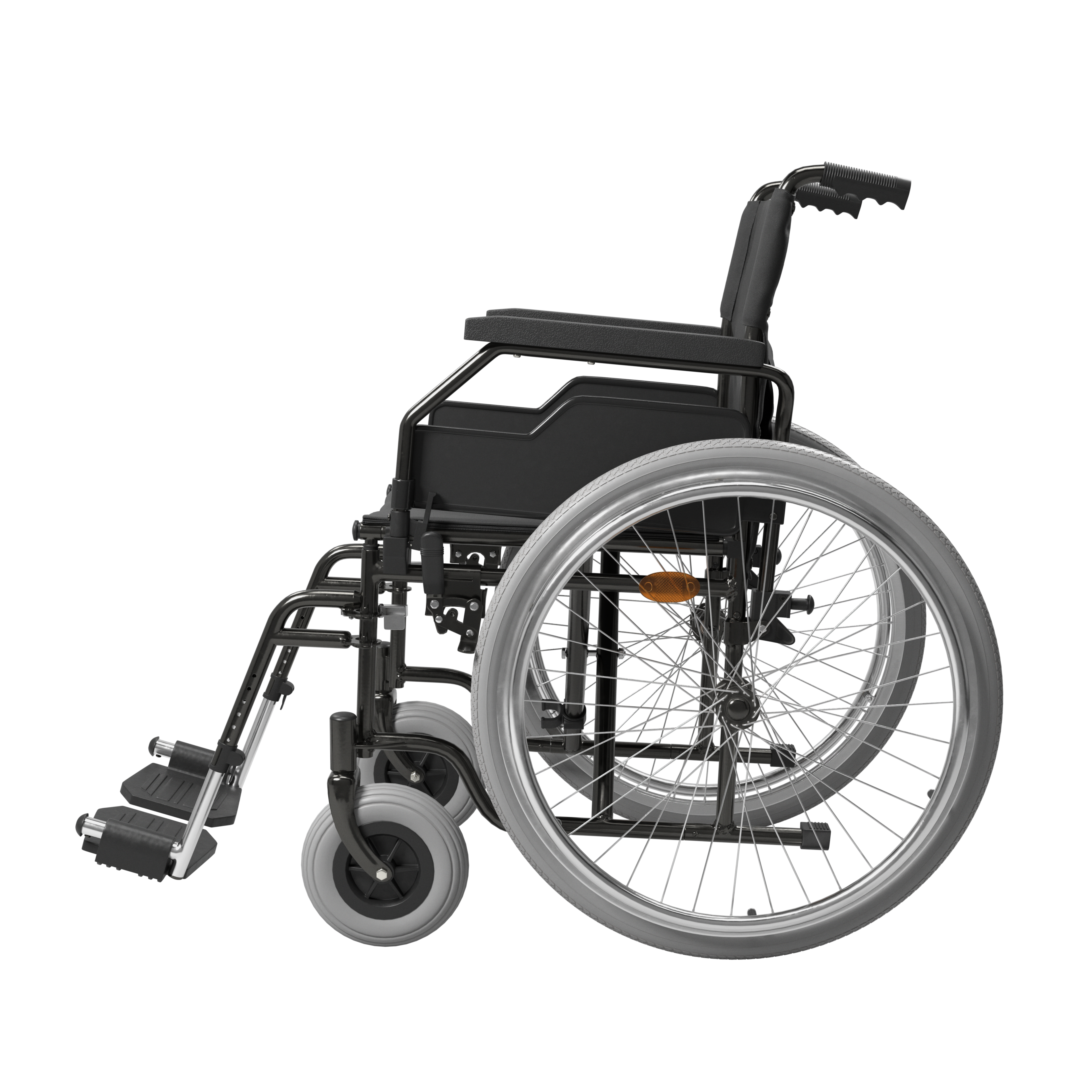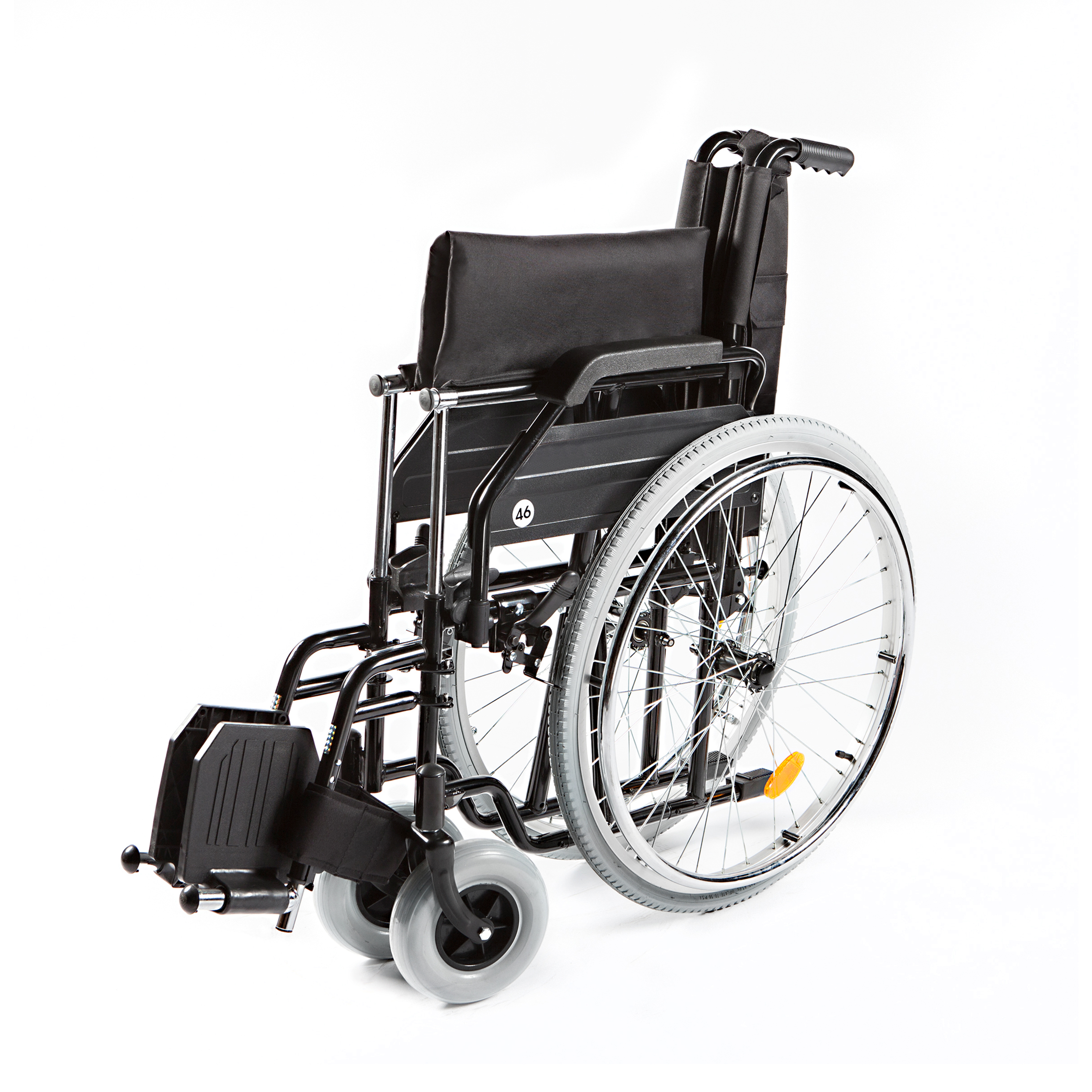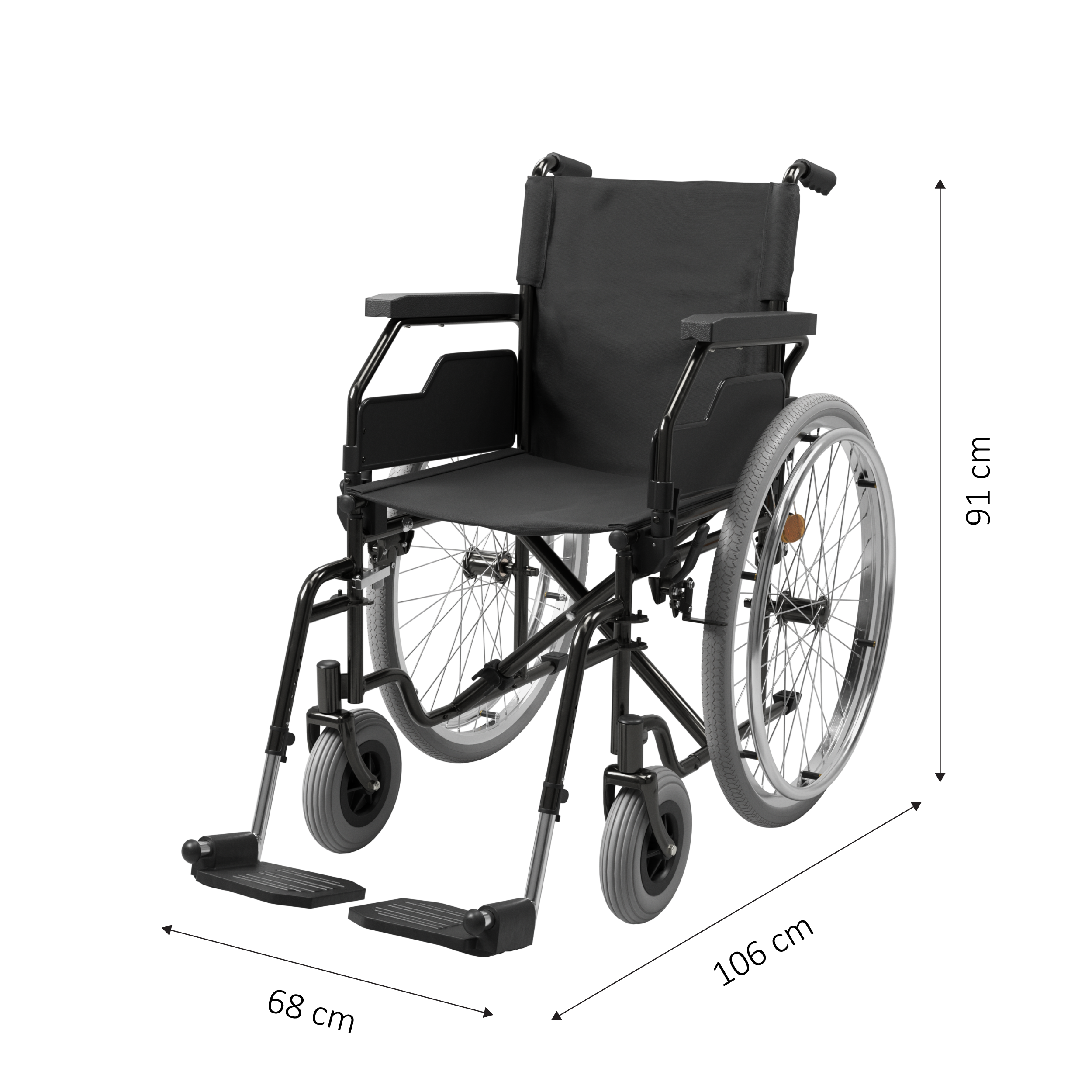 Fotoliu rulant robust din oțel, disponibil în mărimi de la 38 la 51 cm, cu design pliabil și suporturi detașabile pentru picioare.